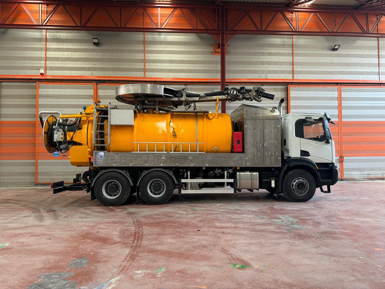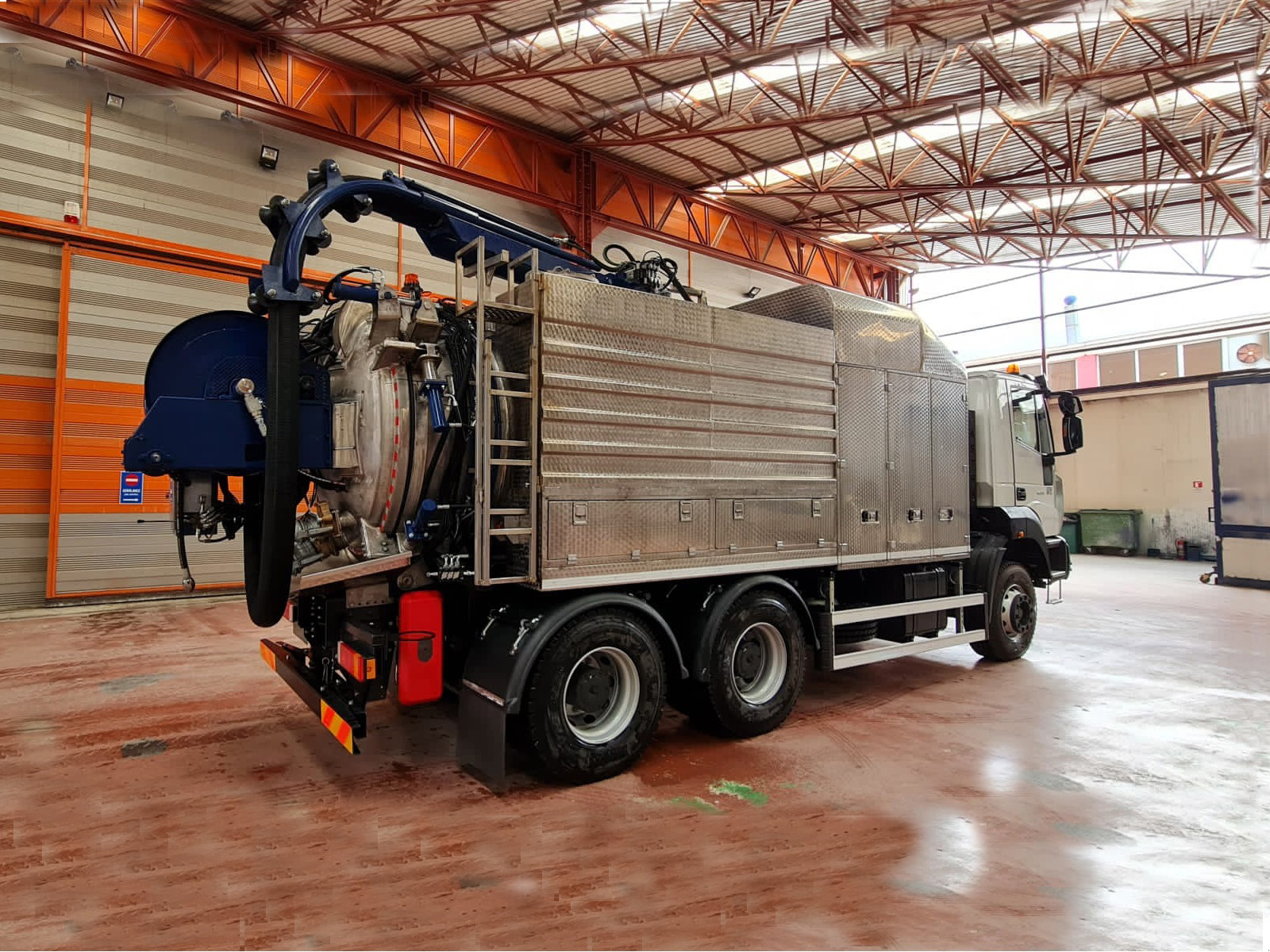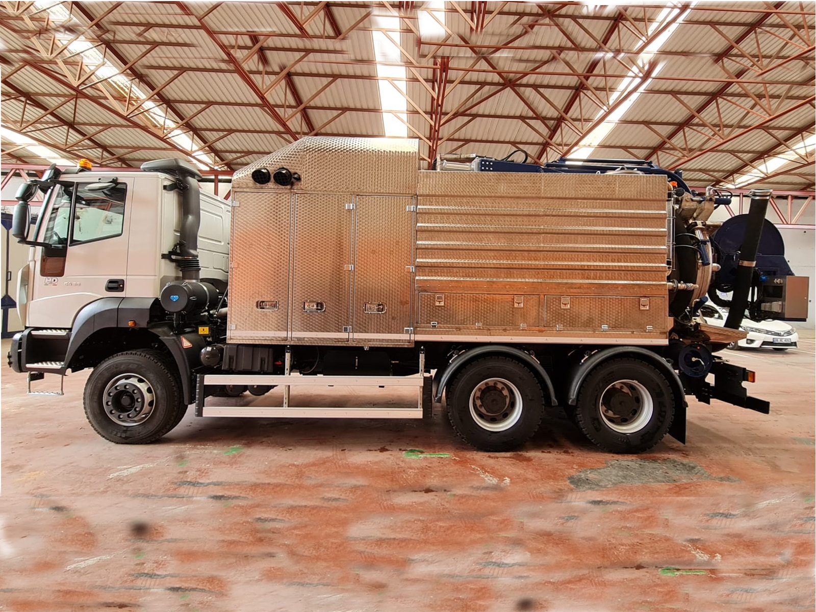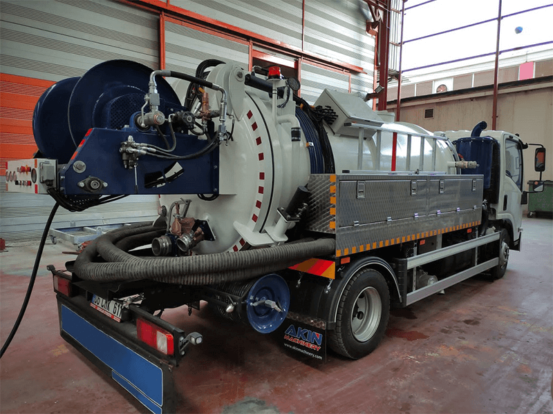 Комбинированная струйно-вакуумная машина имеет вакуумный насос и водяной насос высокого давления. Он оборудован автономным водоснабжением в качестве источника воды для насоса высокого давления и цилиндрическим резервуаром для сбора всех материалов из канализационной системы. Он также может выполнять одновременную промывку канализационных труб под высоким давлением и удаление жидкостей и твердых частиц из канализационного люка.