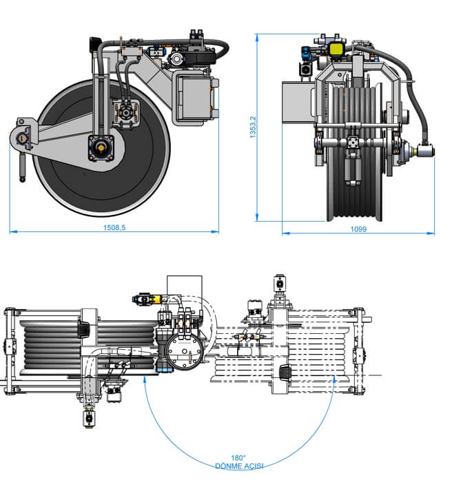 Döner kanal açma tamburu, üzerine hidrolik olarak dönen bir metal tamburun monte edildiği çelik bir çerçeveden oluşur. Hortumları, özellikle yüksek basınçlı su hortumlarını tutmak ve taşımak için tasarlanmıştır.